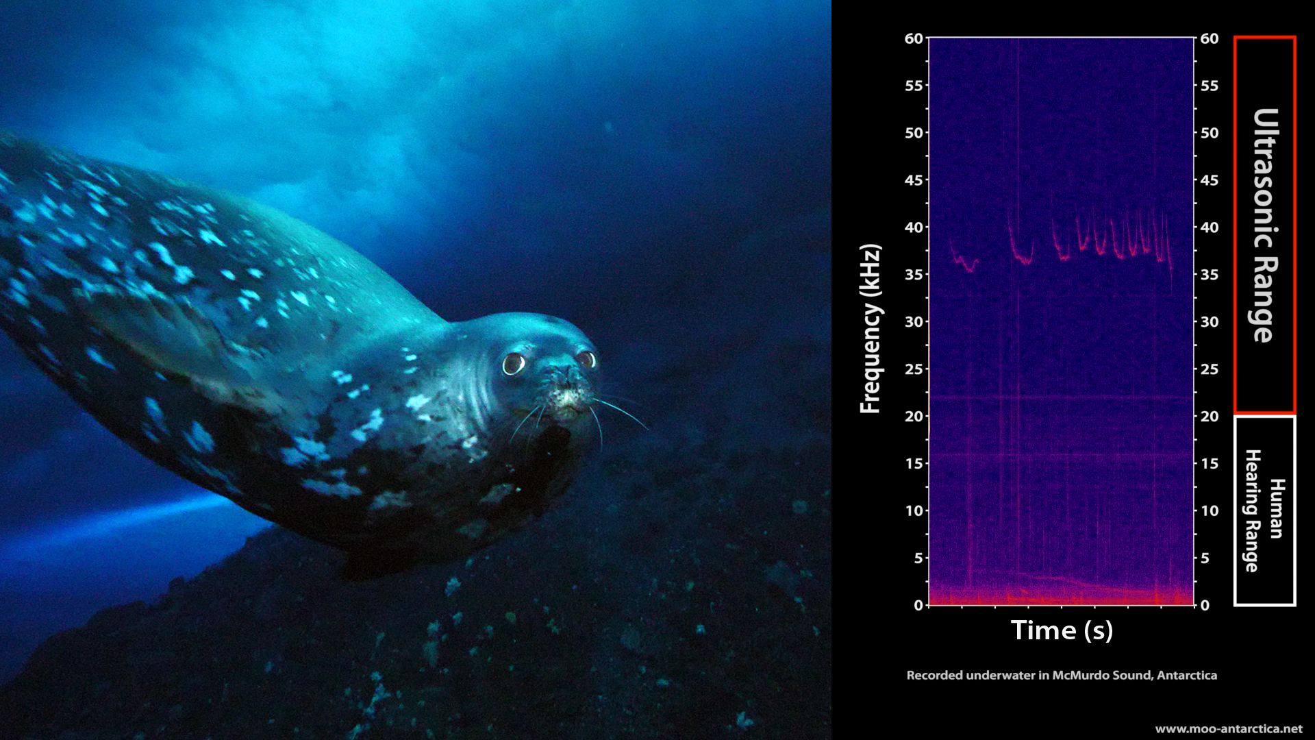 We discovered that Weddell seals regularly vocalize at ultrasonic frequencies, above the range of human hearing. Read the news.